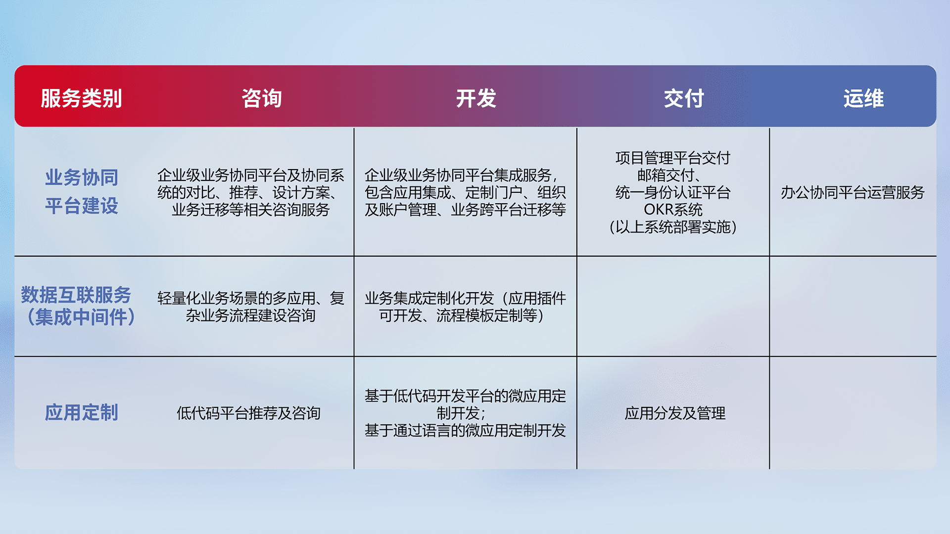 针对钉钉、、、企微、、、IDaas等平台级产品提供产品的规划、、、方案、、、、交付、、、定制化开发等服务,,,,实现如统一协同办公、、、智能客户服务、、、、混合会议管理、、智能数据查询、、等业务场景,,,,实现数字化转型。。