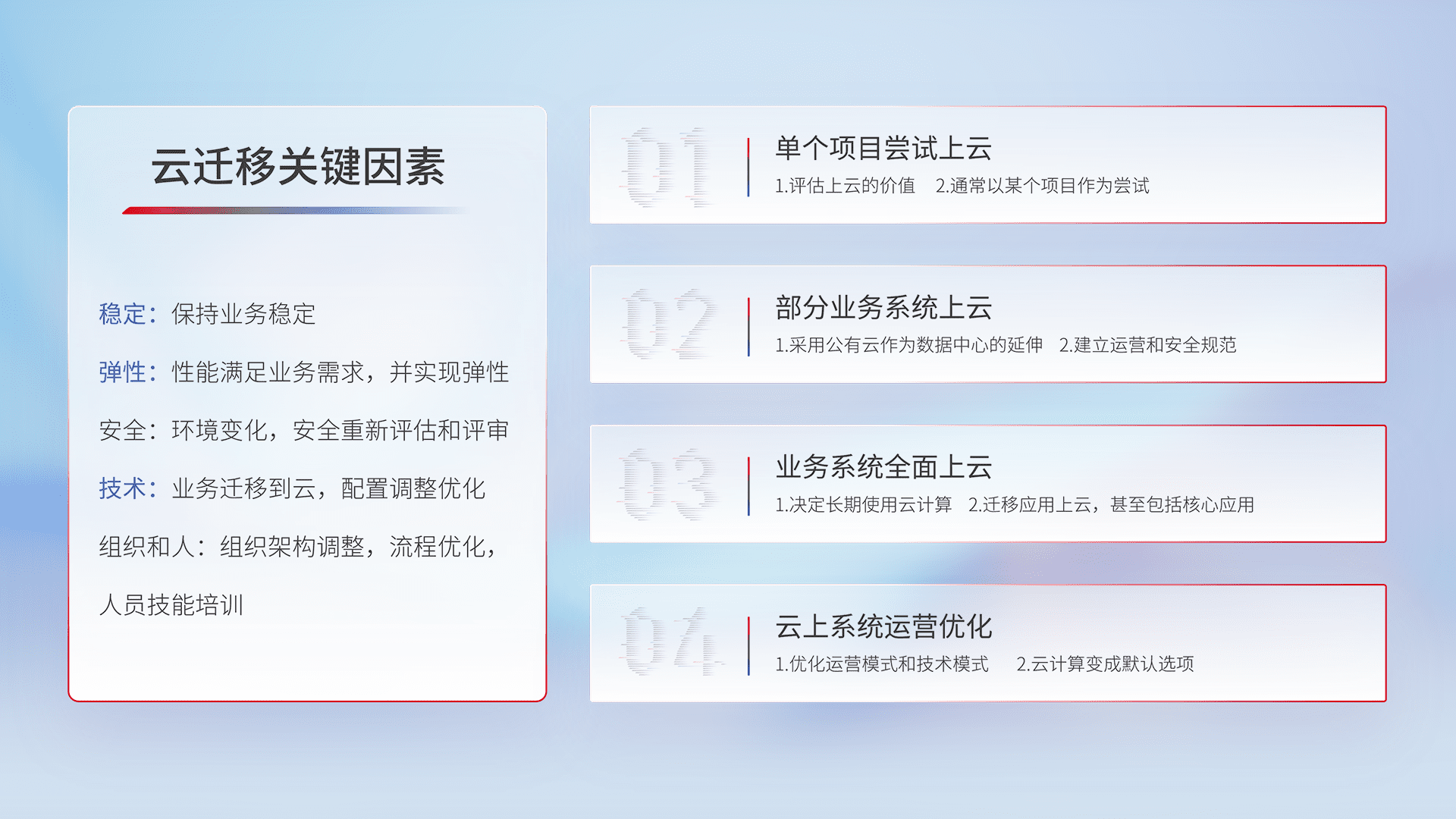 结合实际业务,,从规划设计、、、、云平台选型、、、云原生改造、、数据迁移、、、集成交付,,,,迁移全过程为客户识别最佳上云路径,,做好风险识别管理,,,,设计网络架构、、、、身份权限、、安全审计合规、、操作审计、、日志审计、、、监控告警策略、、、多站点容灾设计等,,,,对云上基础设施进行整体规划,,提升IT治理水平,,,以满足弹性、、、、高可用、、高性能的需求。。