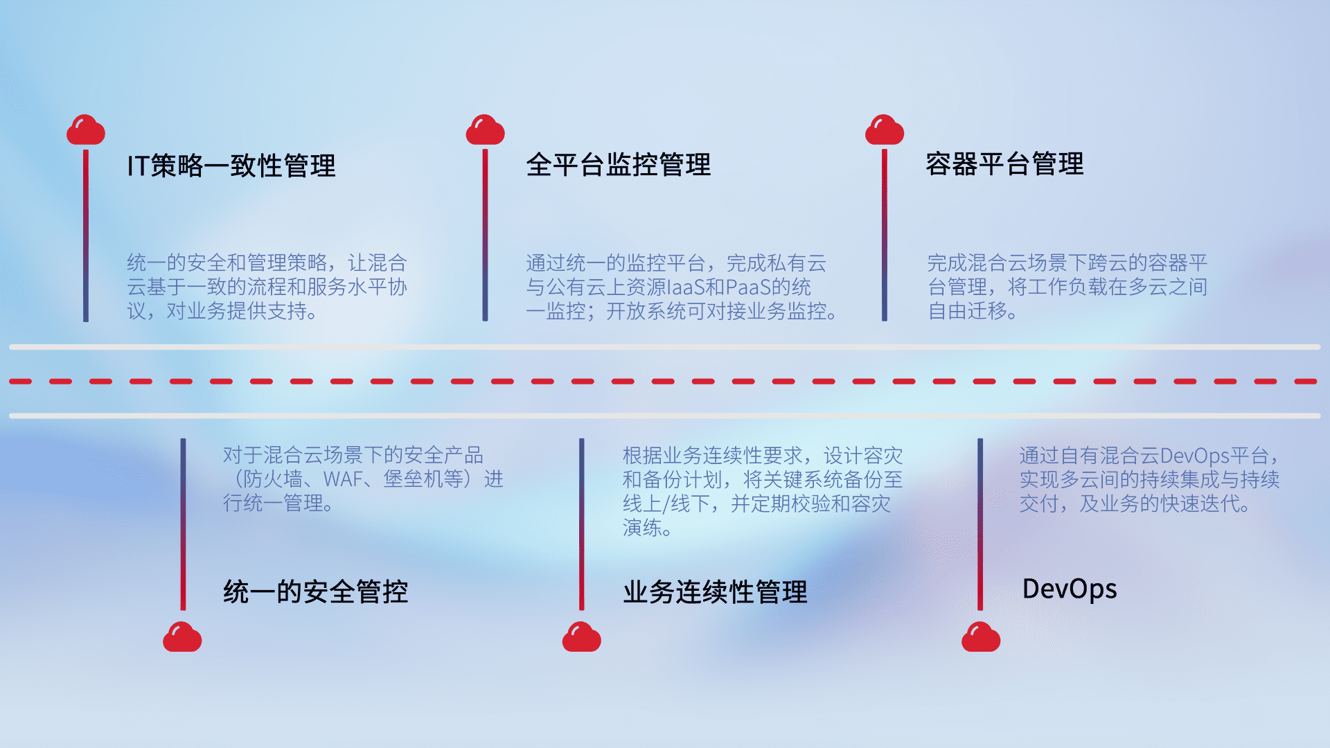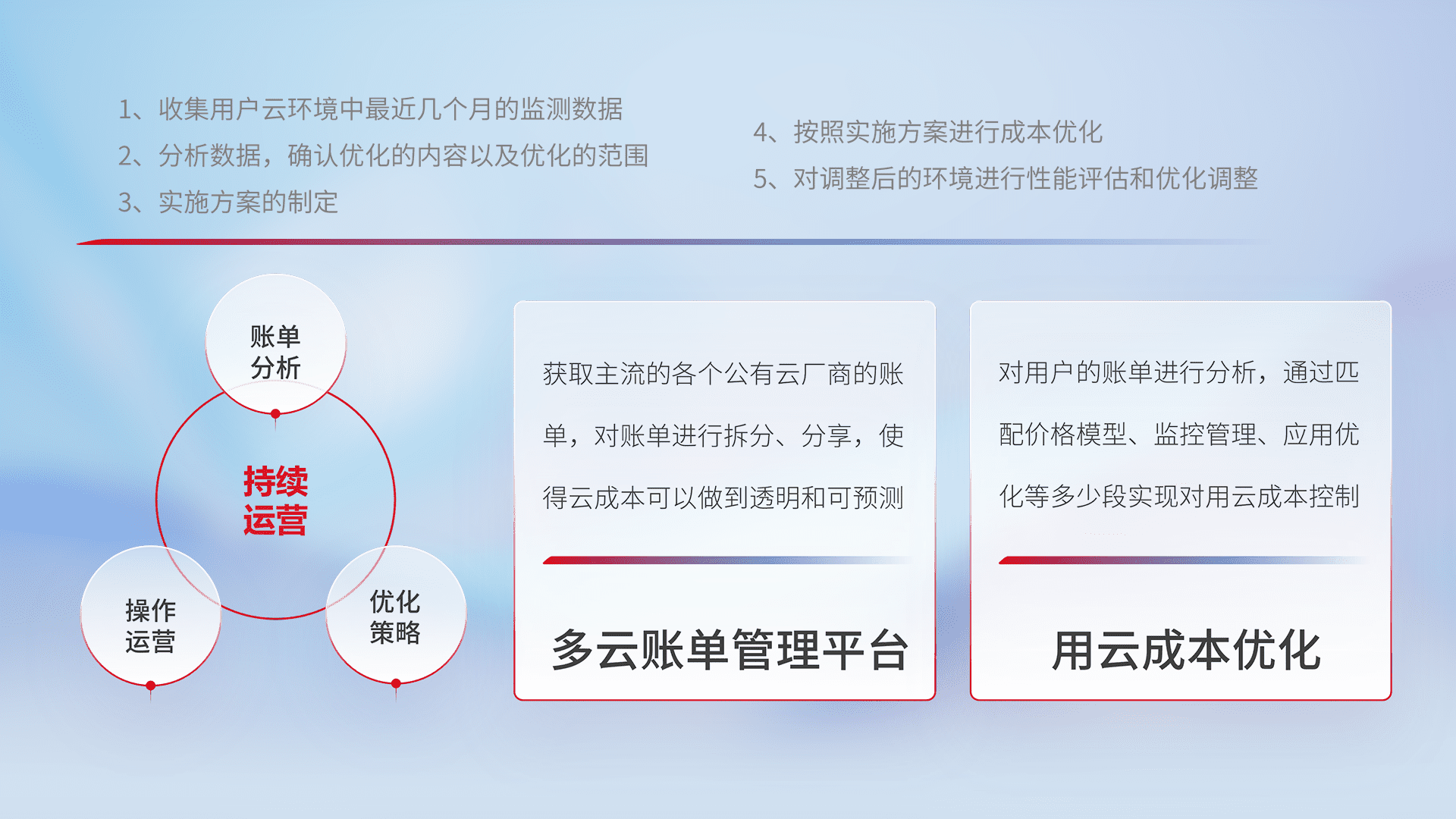 通过多云纳管,,以统一的资源数据模型把客户的云资源进行抽象和封装,,,,进而实现对多云资源的统一操作,,保障云资源管理的可靠性、、、稳定性与可用性。。量身定制化运维内容,,,配置、、、开发运维、、、、补丁管理、、、备份、、、、监控、、、认证和访问管理、、审计和日常巡检等,,,保障在用云过程中的可靠度,,稳定度以及高可用率。。。。